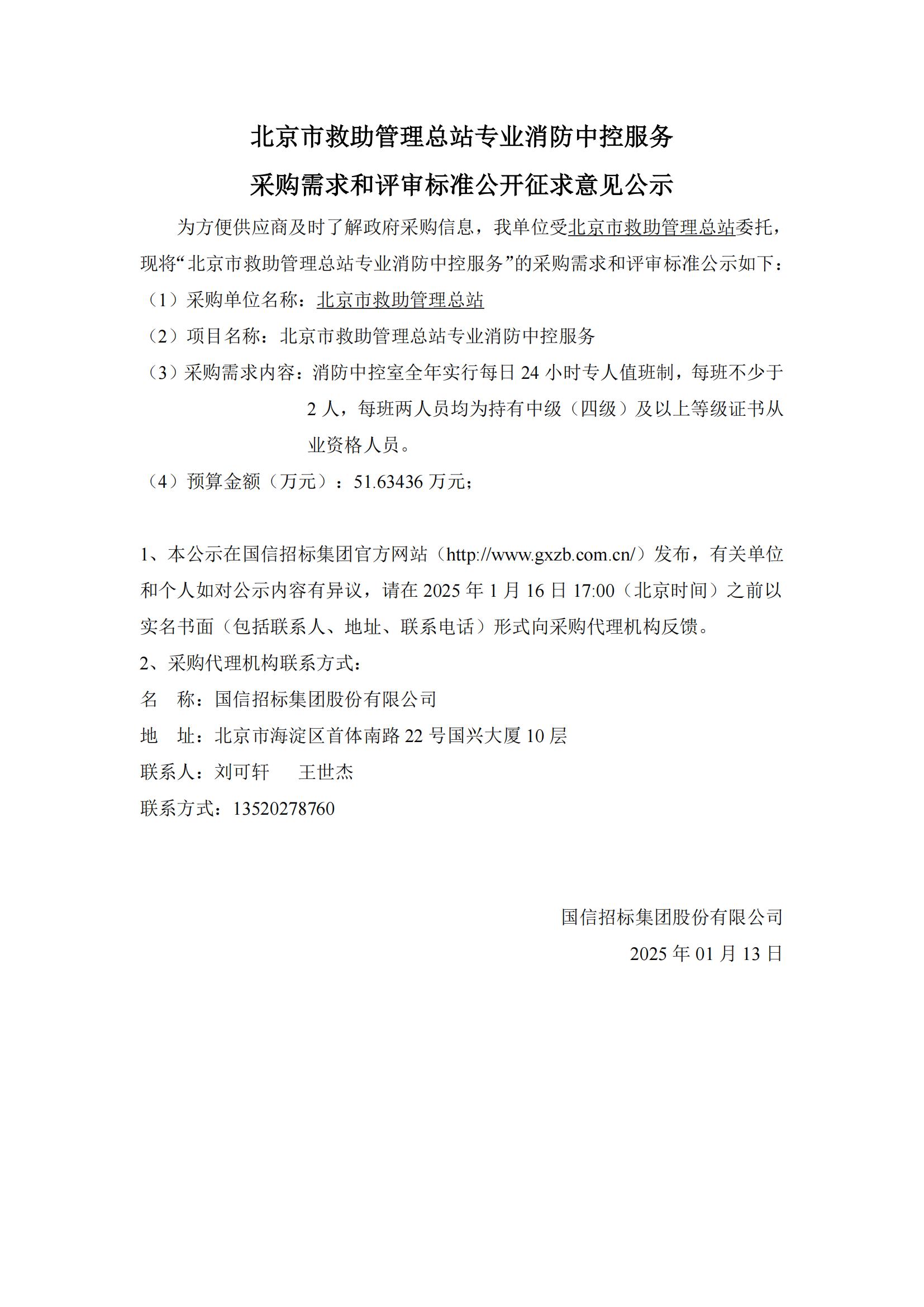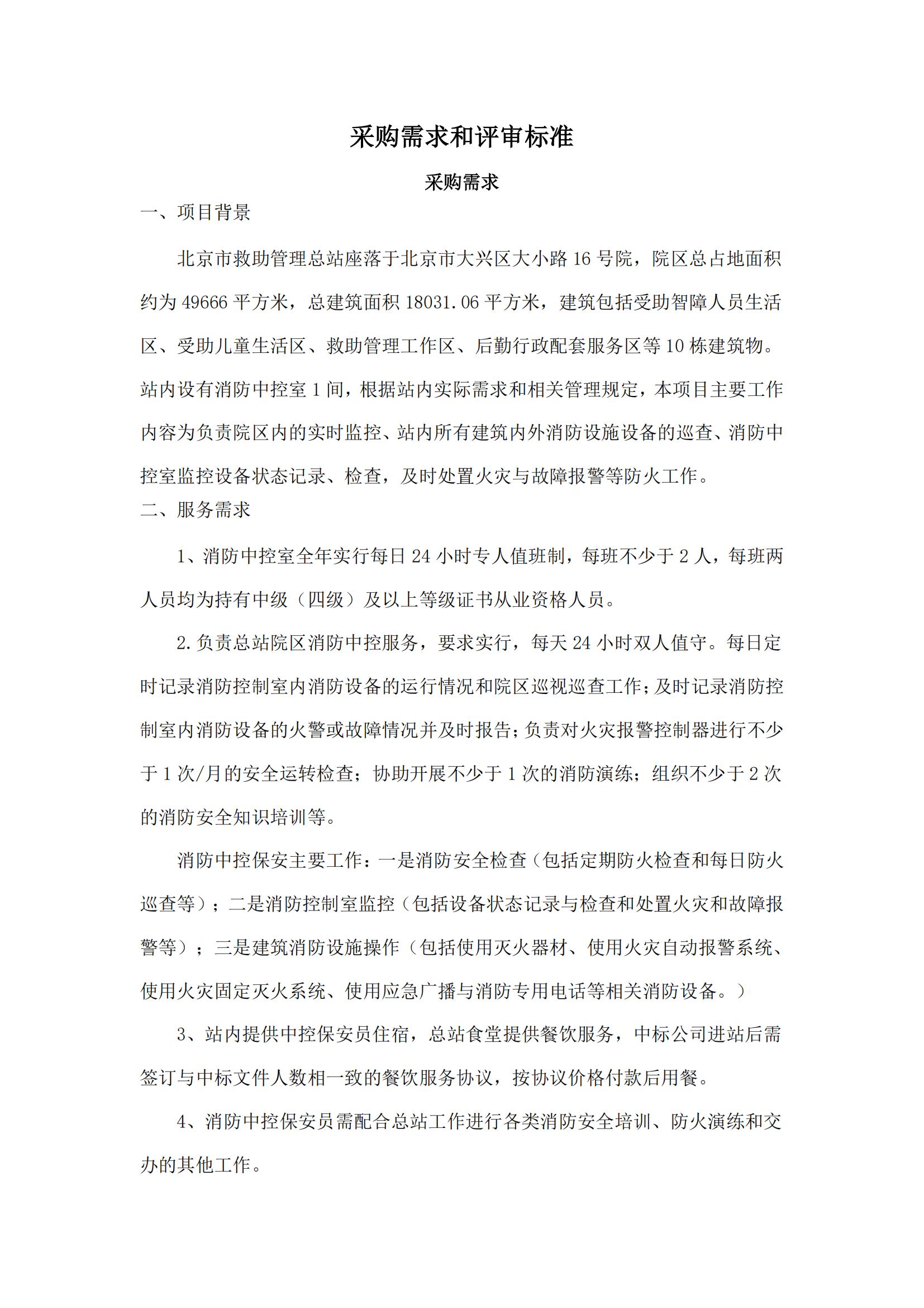 采購(gòu)需求和評(píng)審標(biāo)準(zhǔn)公示版————北京市救助管理總站專業(yè)消防中控服務(wù)