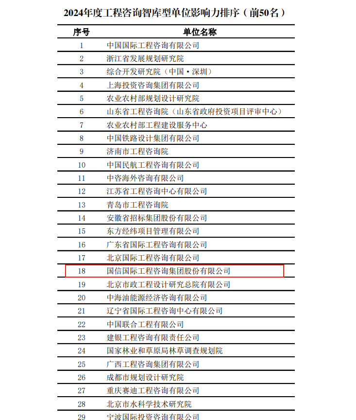 近日,中國工程咨詢協(xié)會(以下簡稱“中咨協(xié)會”)發(fā)布了2024年度工程咨詢智庫型單位影響力行業(yè)排名。國信國際工程咨詢集團股份有限公司(以下簡稱“國信咨詢集團”)憑借卓越的服務(wù)能力、專業(yè)實力和行業(yè)影響力,從全國眾多參評單位中脫穎而出,位列榜單第18名。